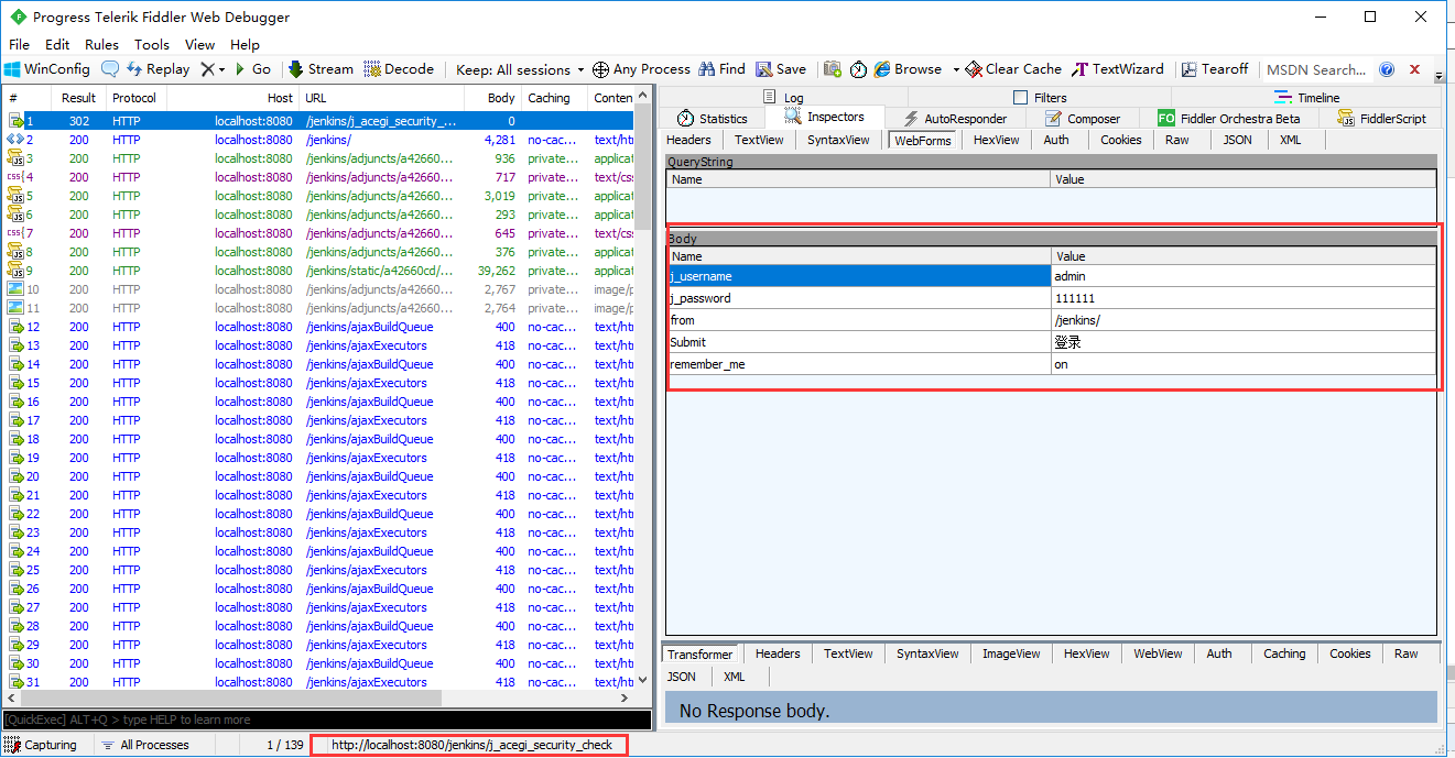 2、fiddler抓包工具抓取jenkins登录的过程。从下图红色圈住的部分可以看到登录的URL和请求登录发送的参数。如下图所示: