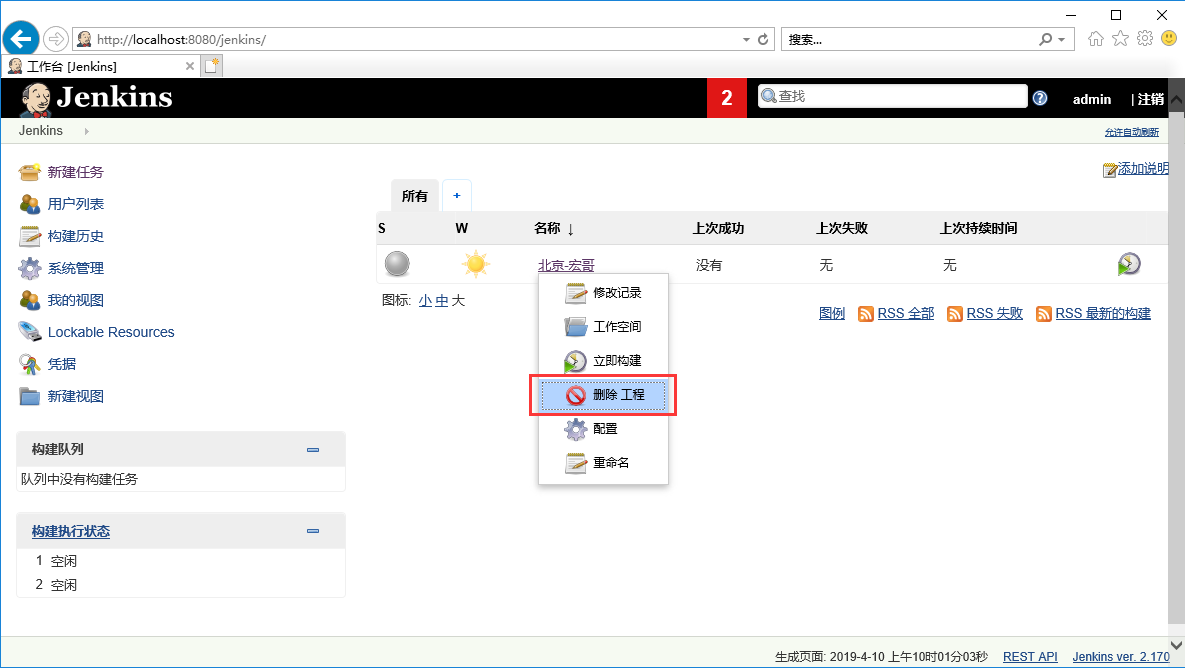 4、查看Jenkins的新建任务,没有看到“北京-宏哥”,说明删除成功了,如下图所示: