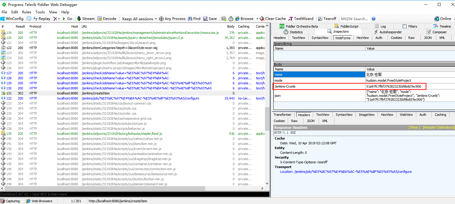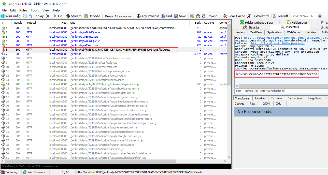 2、用fiddler抓包,抓到删除新建任务的请求,从抓包结果可以看出,传的data参数是Jenkins-Crumb。如下图所示:
