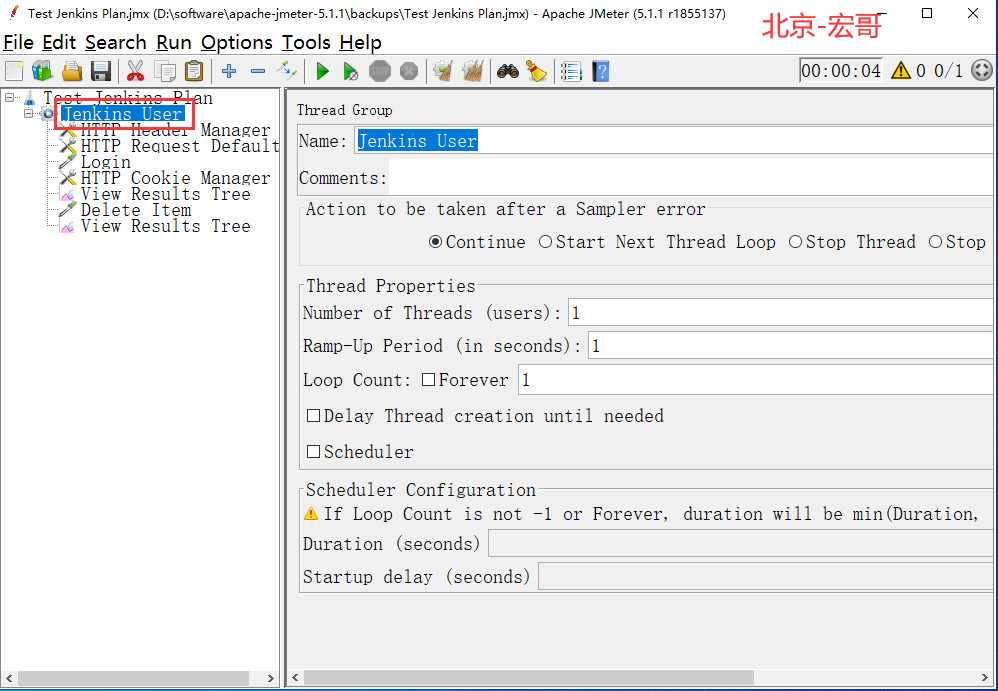 2.选中测试计划,添加线程组用户,命名为:Jenkins User。如下图所示: