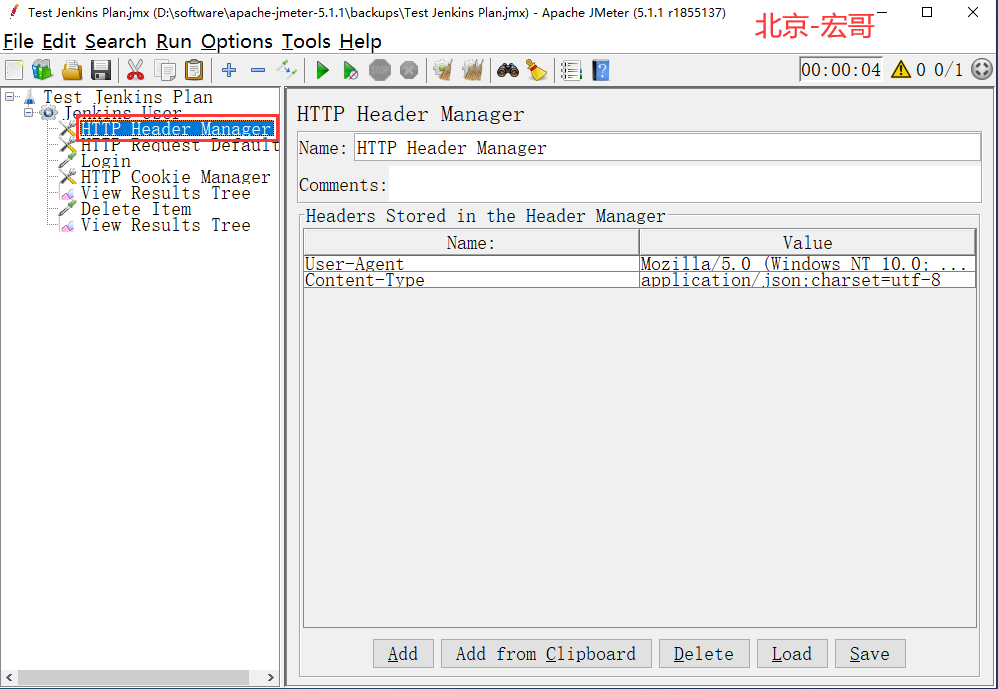 该HTTP头管理器可以让你定制什么样的信息JMeter的HTTP请求头发送。此标头包含“用户代理”,“编译指示”,“推荐人”等属性。