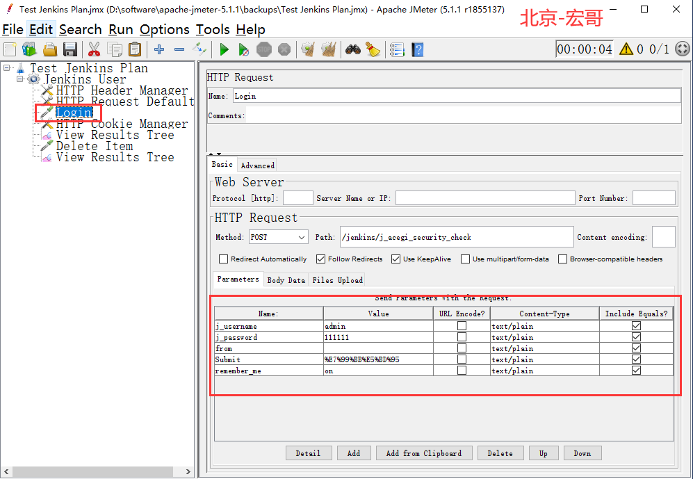 按照抓包抓取到的参数,我们下一步就是用Jmeter模拟登录到Jenkins。