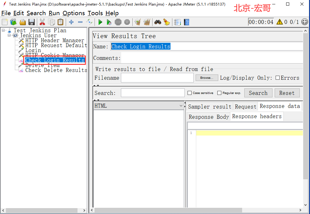 7.选中线程组,添加一个结果树,命名为:Check Login Results,监听登录是否成功。如下图所示:
