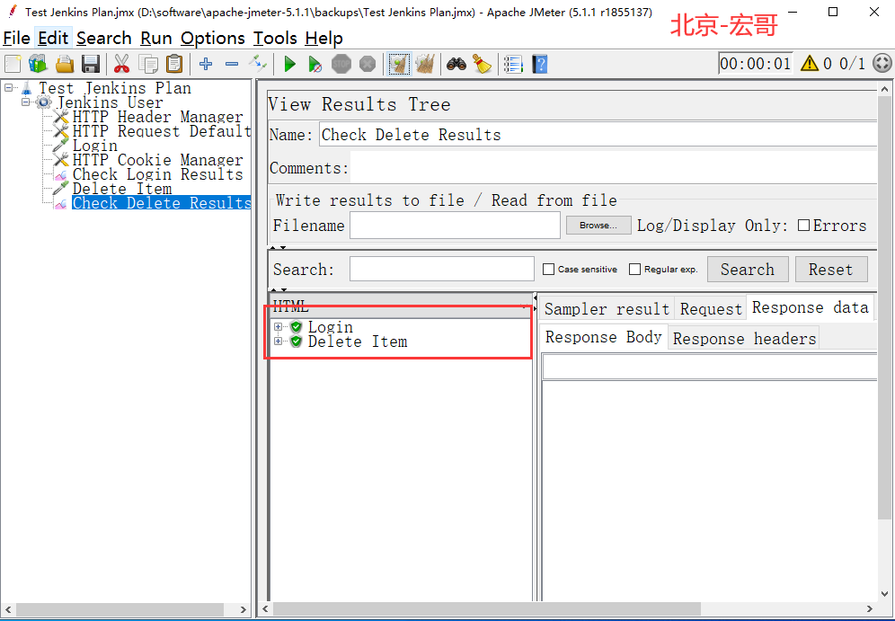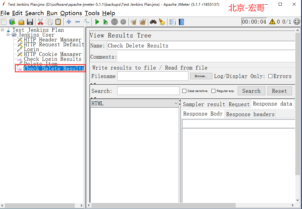 9.选中线程组,添加一个结果树,命名为:Check Delete Results,监听删除job是否成功。如下图所示: