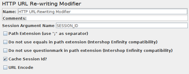 为了正确响应URL重写,JMeter需要解析从服务器接收的HTML并检索唯一的会话ID。使用适当的HTTP URL重写修饰符 可以完成此操作。只需将您的会话ID参数的名称输入到修饰符中,它将找到它并将其添加到每个请求中。如果请求已经有一个值,它将被替换。如果是“缓存会话ID?” 如果选中,则将保存最后找到的会话ID,如果先前的HTTP示例不包含会话ID,则将使用该ID。