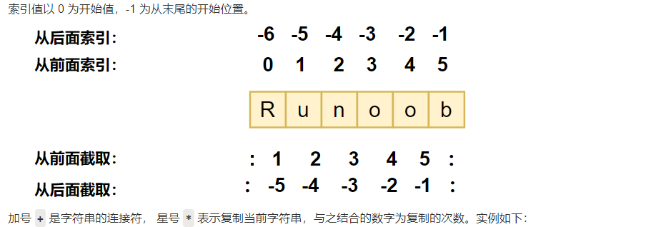 str = 'Runoob' print (str) # 输出字符串 print (str[0:-1]) # 输出第一个到倒数第二个的所有字符 print (str[0]) # 输出字符串第一个字符 print (str[2:5]) # 输出从第三个开始到第五个的字符 print (str[2:]) # 输出从第三个开始的后的所有字符 print (str * 2) # 输出字符串两次,也可以写成 print (2 * str) print (str + "TEST") # 连接字符串