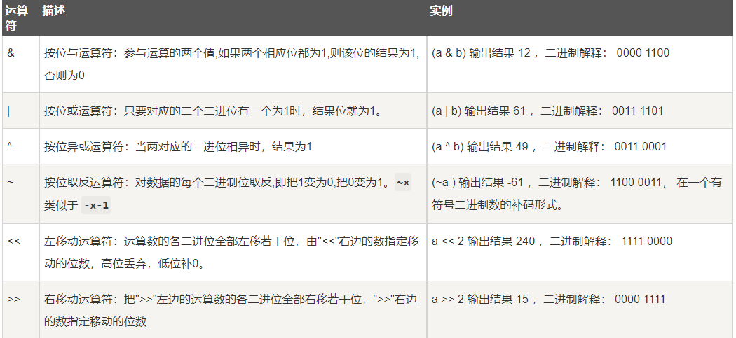 按位运算符是把数字看作二进制来进行计算的。下表中变量 a 为 60,b 为 13。