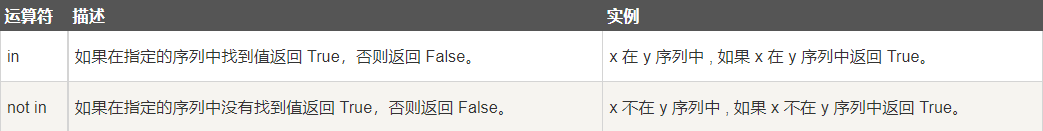 除了以上的一些运算符之外,Python还支持成员运算符,测试实例中包含了一系列的成员,包括字符串,列表或元组。