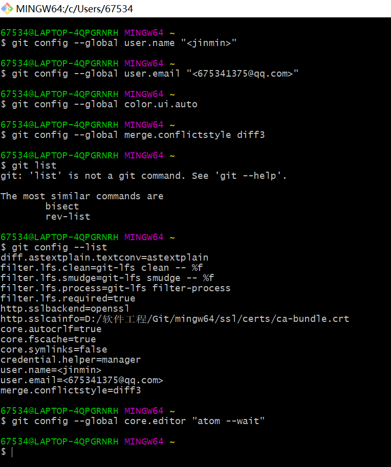 设置自己的Git用户名、邮箱及输出内容带有颜色标记,并对比初始状态。