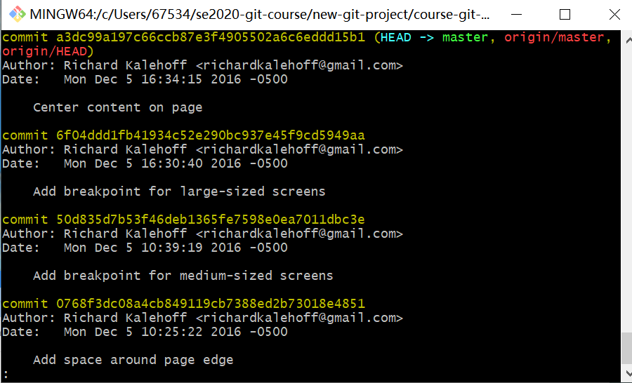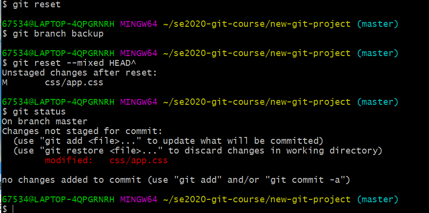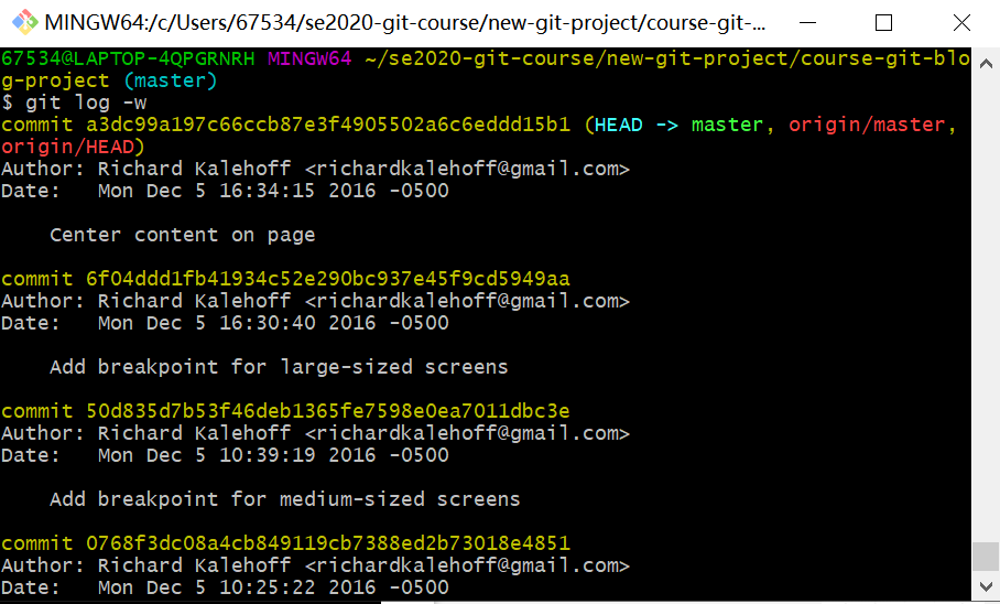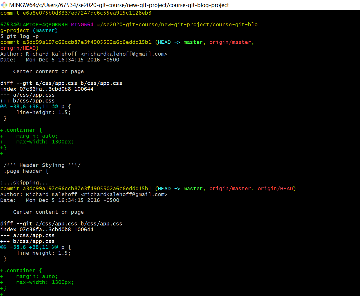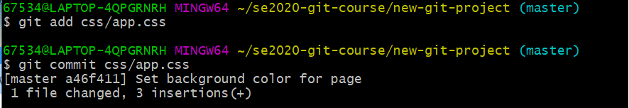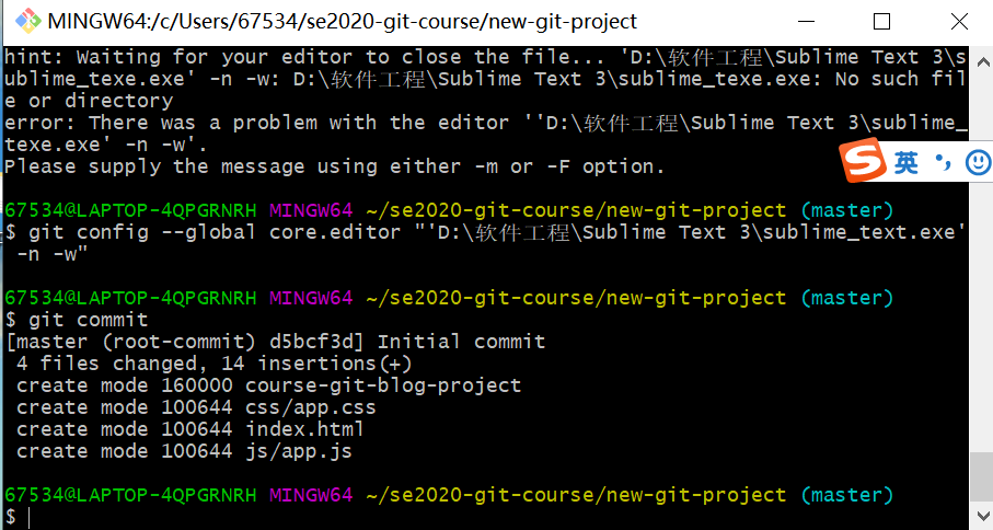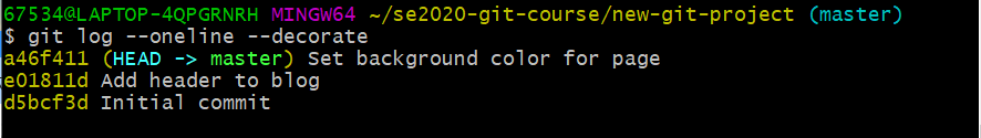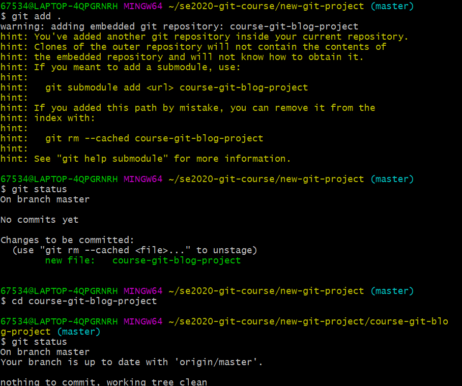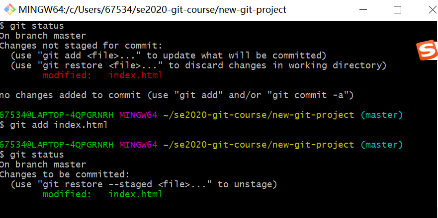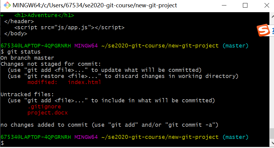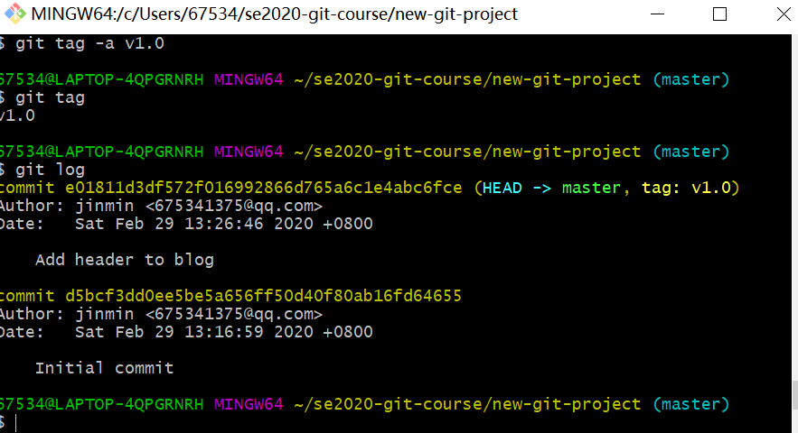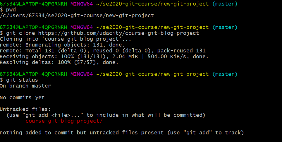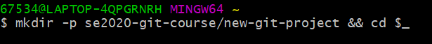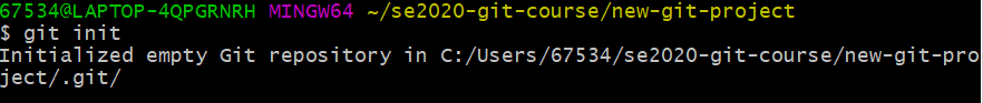 1)创建一个目录,叫做 se2020-git-course,在该目录中,创建另一个目录,叫做 new-git-project,使用 cd 命令移到 new-git-project 目录下。