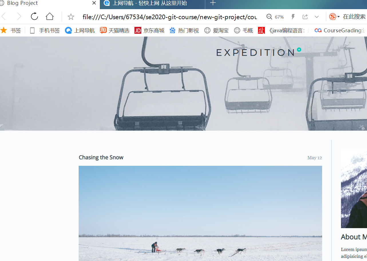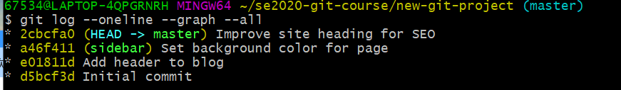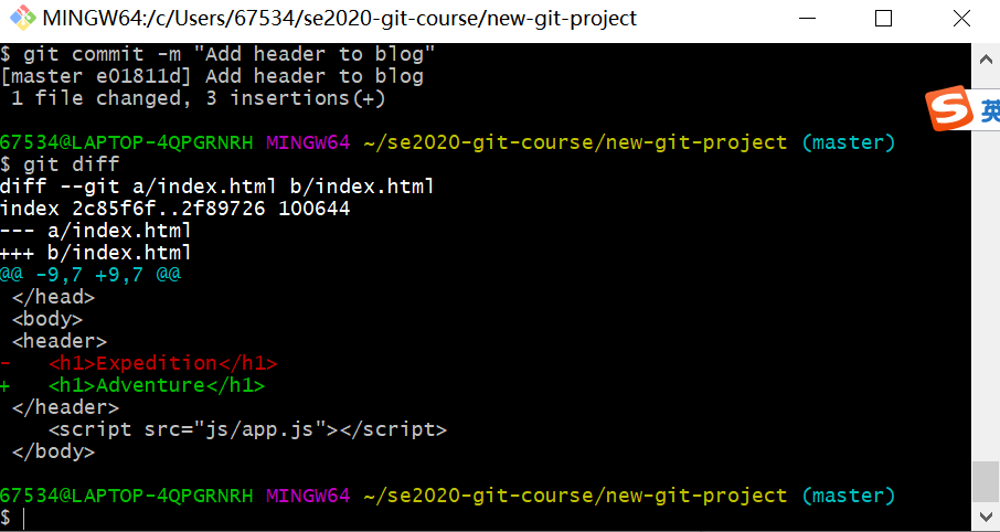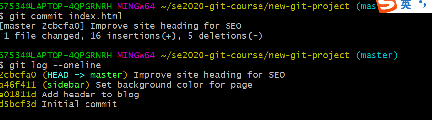 使用 git checkout命令切换到 master分支。将页面的 <h1> 标题从"Expedition"改为"Adventure"。保存 index.html 文件并进行 commit 以将此更改添加到仓库中。( commit 消息"Improve site heading for SEO"),提交后用git log --oneline 检查。