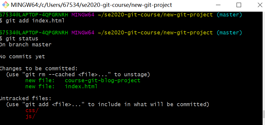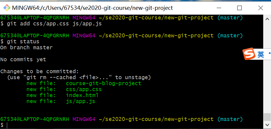 1)在new-git-project里 创建 index.html 文件,添加代码;建立 js 和css 文件夹,并在文件下分别建立 app.js 和 app.css 文件,文件内容可为空。运行git add index.html命令,使用 git add 将 index.html 添加到暂存区。