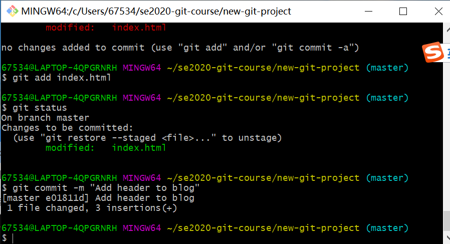 使用 git commit 命令提交 commit,并添加提交说明 Add header to blog,运行git status,添加标题后在进行提交。