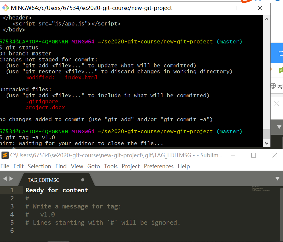 进入news-git-project,输入git tag 命令,使用 git tag 命令与仓库的标签进行交互,上述命令将打开代码编辑器,并等待你为标签输入信息。我们输入"Ready for content"作为tag。只需输入 git tag,命令行会显示仓库中的所有标签。