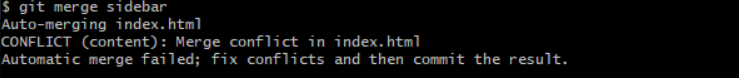 合并失败时,就称为合并冲突。大部分情况下,git 将能够成功地合并分支。但是,有时候 git 无法完全自动地进行合并。合并失败时,就称为合并冲突。
