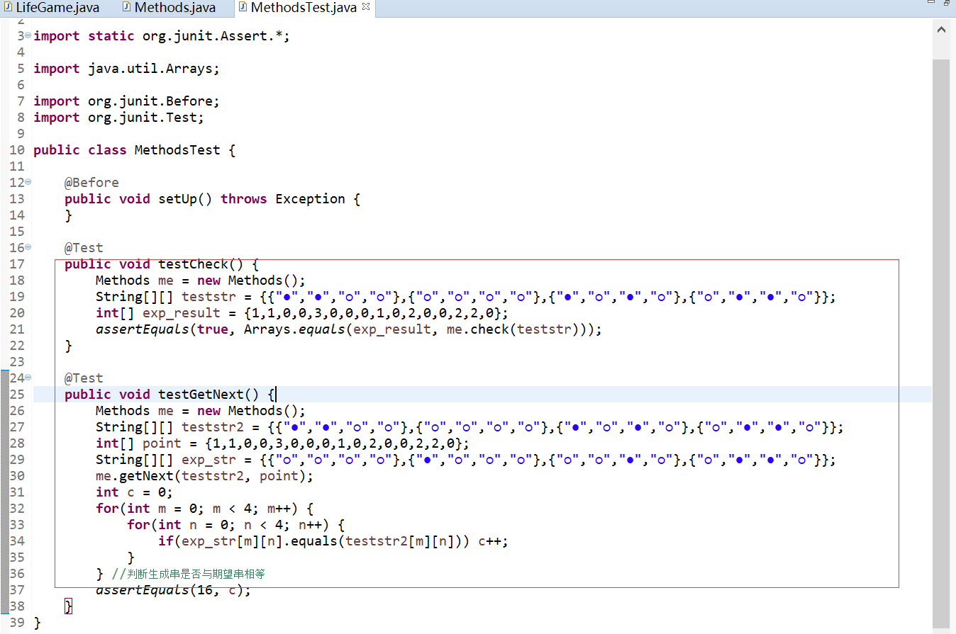 1 package lifegame; 2 3 public class Methods { 4 public Methods() { 5 } 6 7 //该方法检测所有位置,并返回对应位置的point数组 8 //用point数组,记录对应位置下一轮的状态,1下一代死,2下一代继续活,3下一代复活 9 public int[] check(String[][] lifeMap, int[] point) { 10 11 int n = 0; 12 //统计周围邻居的情况 13 for (int i = 0; i < 4; i++) { 14 for (int j = 0; j < 4; j++) { 15 16 /* 17 规则如下,进行判断 18 ( 1)一个人可以有8个邻居; 19 ( 2)一个人若只有一个邻居,在下一代会孤独的死去; 20 (3)若有2或3个邻居,在下一代依然活着; 21 (4)若有4个或以上邻居,在下一代会因拥挤而死; 22 (5)死去的人若有3个邻居,在下一代会复活; 23 (6)所有的死去或复活都在下一代变化时同时发生。 24 */ 25 26 //用life变量记录周围活着的邻居个数 27 int life = 0; 28 29 //1.判断正下方的位置 30 if (i + 1 < 4 && lifeMap[i + 1][j].equals("●")) { 31 life++; 32 } 33 34 //2.判断右下位置 35 if (i + 1 < 4 && j + 1 < 4 && lifeMap[i + 1][j + 1].equals("●")) { 36 life++; 37 } 38 39 //3.判断左下位置 40 if (i + 1 < 4 && j - 1 >= 0 && lifeMap[i + 1][j - 1].equals("●")) { 41 life++; 42 } 43 44 //4.判断右侧位置 45 if (j + 1 < 4 && lifeMap[i][j + 1].equals("●")) { 46 life++; 47 } 48 49 //5.判断左侧位置 50 if (j - 1 >= 0 && lifeMap[i][j - 1].equals("●")) { 51 life++; 52 } 53 54 //6.判断正上方位置 55 if (i - 1 >= 0 && lifeMap[i - 1][j].equals("●")) { 56 life++; 57 } 58 59 //7.判断右上位置 60 if (i - 1 >= 0 && j + 1 < 4 && lifeMap[i - 1][j + 1].equals("●")) { 61 life++; 62 } 63 64 //8.判断左上位置 65 if (i - 1 >= 0 && j - 1 >= 0 && lifeMap[i - 1][j - 1].equals("●")) { 66 life++; 67 } 68 69 //用一个数组,记录对应位置下一轮的状态,1下一代死,2下一代继续活,3下一代复活 70 if (lifeMap[i][j].equals("●")) { 71 if (life == 1) 72 point[n] = 1; 73 else if (life == 2 || life == 3) 74 point[n] = 2; 75 else if (life >= 4) 76 point[n] = 1; 77 } else { 78 if (life == 3) 79 point[n] = 3; 80 } 81 n++; 82 } 83 } 84 return point; 85 } 86 87 public String[][] getNext(String[][] lifeMap, int[] point) { 88 89 int n = 0; 90 for (int i = 0; i < 4; i++) { 91 for (int j = 0; j < 4; j++) { 92 93 //变更状态 94 if (point[n] == 1) 95 lifeMap[i][j] = "○"; 96 if (point[n] == 3) 97 lifeMap[i][j] = "●"; 98 99 n++; 100 } 101 } 102 return lifeMap; 103 } 104 105 public void printLifeMap(String[][] lifeMap){ 106 for (int i = 0; i < 4; i++) { 107 for (int j = 0; j < 4; j++) { 108 if (j == 3) 109 System.out.println(lifeMap[i][j] + " "); 110 else 111 System.out.print(lifeMap[i][j] + " "); 112 } 113 } 114 } 115 }