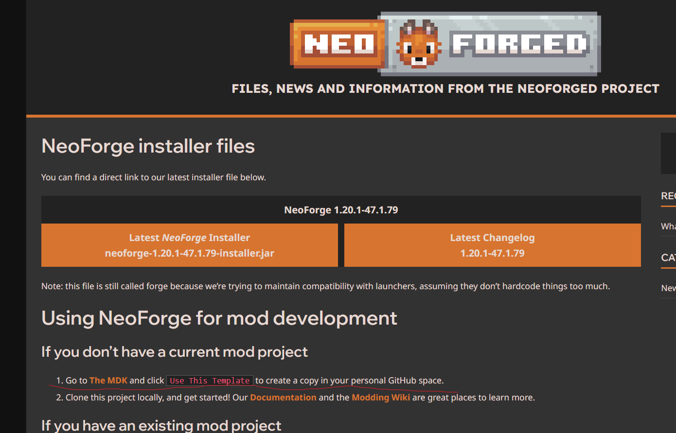 开发模组所需要的语言是java语言,使用的是Forge API来进行模组的开发,但是由于Forge团队内部的一些矛盾,大部分核心成员另外开了一个新的分支neoForge,目前两者没有什么区别,保险起见,我们就选择neoForge进行开发。首先是下载java开发所需要的环境:jdk17和idea编译器,具体下载可以自行百度,这里不在说明。然后最重要的来了,我们要去neoForge官方网站https://neoforged.net/下载模组开发所需要的MDK包。