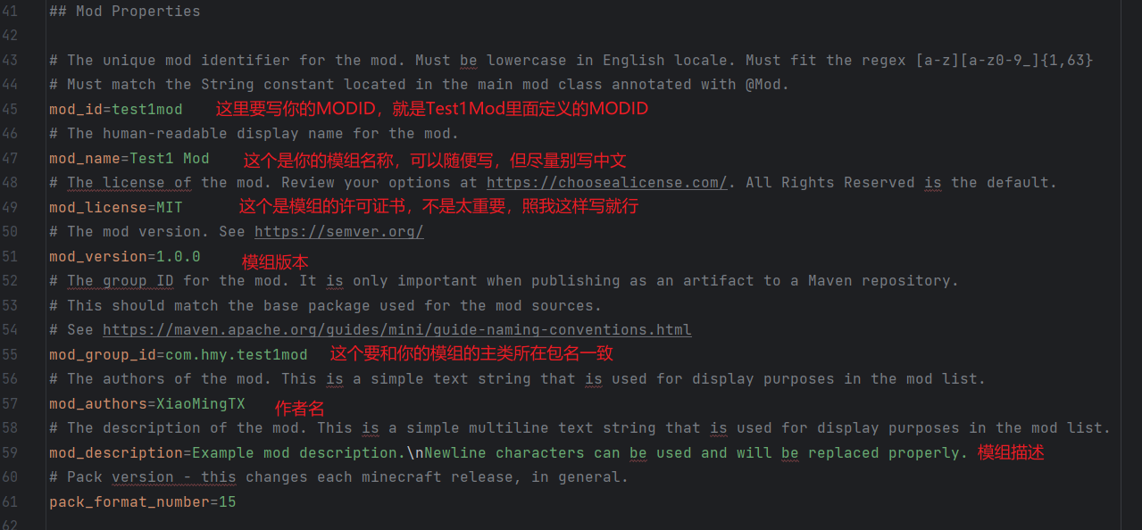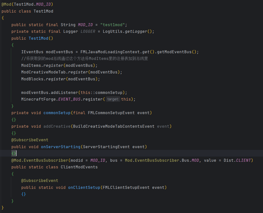 一开始的原始目录下会有一个ExampleMod的java类,这是我们整个模组的很重要的一个类各种信息都要写在里面,我们需要对他进行一些修改,把ExampleMod类名改成自己的类名。我这里改成了Test1Mod,可以使用快捷键将所有ExampleMod改为Test1Mod,然后定义一个常量MOD_ID,是我们这个模组的id值,尽量用这个类名的小写表示,里面一些无关紧要的方法可以先删除,只保留图片里的几个方法就行。