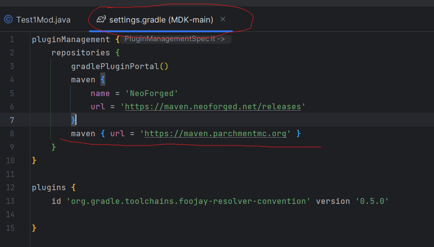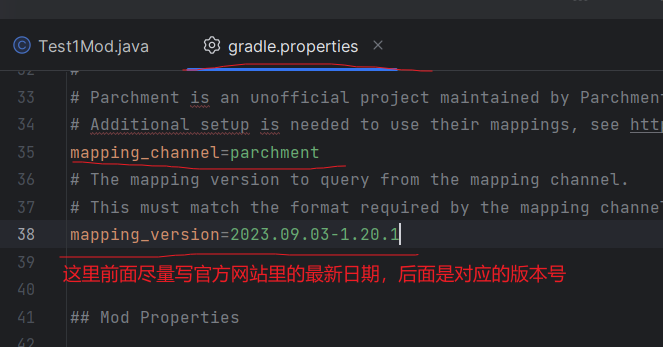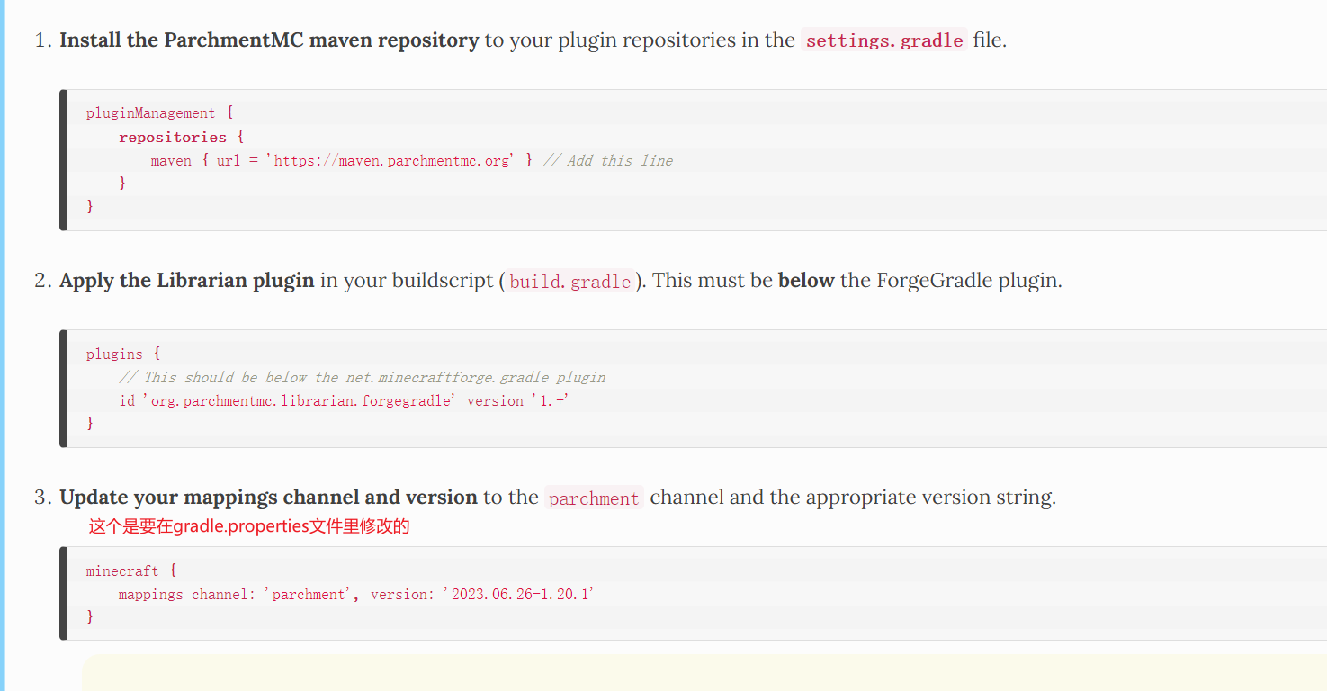 接着我们需要进入这个网站https://parchmentmc.org/docs/getting-started来配置第三方的mapping(就是一个对原版代码进行反混淆的一个东西),按照上面的提示在对应的文件里添加对应的配置即可。