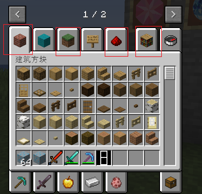 这几步完成后我们就可以在创造模式下看到我们自己添加的物品栏和对应的物品了。但是不是像我这样有贴图的,这是我设置好贴图和材质后的样子。完成上面这些操作后未设置贴图后的物品只是一堆马赛克,后面一篇文章我们就会将如何设置物品的贴图。