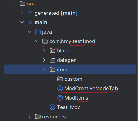 首先和其他Java项目一样,我们先创建对应的包,一般都是com.yourName.modName的结构,接着在该包下新建item包用来存放我们的ModItems类,这个类用来添加我们的item;再创建一个ModCreativeModeTab类,用来把新增的物品放到创造模式物品栏里(这个类可以单独放到一个包里,这里我就直接放在item包下了)。