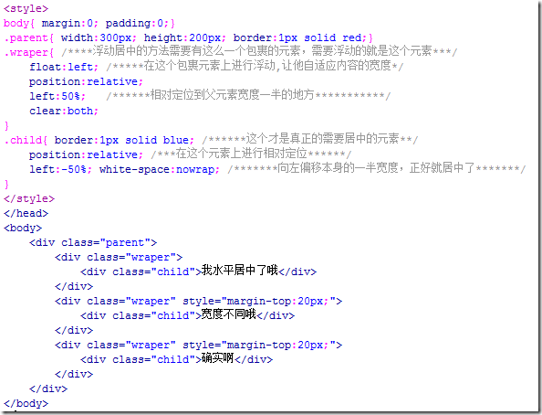浮动居中的原理是:把浮动元素相对定位到父元素宽度50%的地方,但这个时候元素还不是居中的,而是比居中的那个位置多出了自身一半的宽度,这时就需要他里面的子元素再用一个相对定位,把那多出的自身一半的宽度拉回来,而因为相对定位正是相对于自身来定位的,所以自身一半的宽度只要把left 或 right 设为50%就可以得到了,因而不用知道自身的实际宽度是多少。