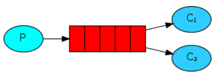 消息被消费者C1,C2共同争抢当前的消息队列内容,谁先拿到谁负责消费消息