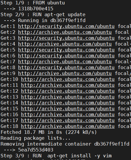 52013ca51f1d 14 minutes ago /bin/sh -c apt-get install -y vim 68.2MB