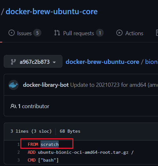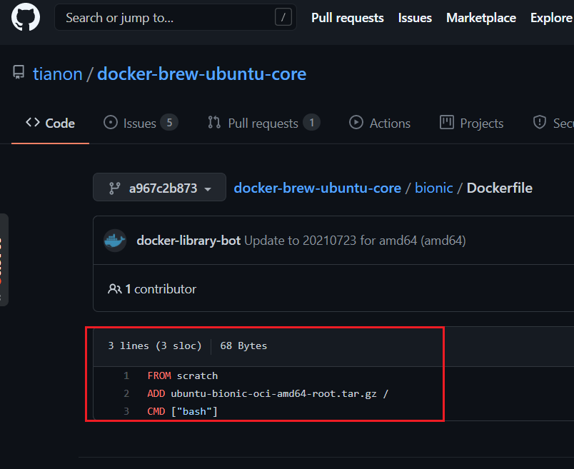 xmtubuntu 这个镜像的构建过程我们可以清晰的看出都执行了哪些步骤,当然,同样的方式,我们也可以看看官方的镜像是如何构建的,我们来看看官方 ubuntu 的