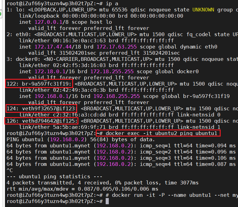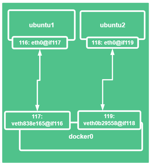 ubuntu2上的网卡信息是118: eth0@if119,他们同样是成对出现的,小伙伴看到这里应该明白了吧