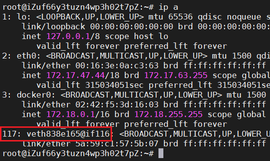 可以发现宿主机的网卡信息 docker0 下面多了117: veth838e165@if116:,ubuntu1的网卡信息上也正好有116: eth0@if117
