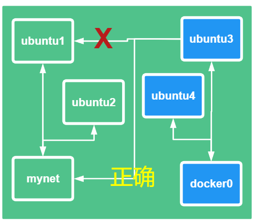 但是我们有办法让 ubuntu3 这个容器通过和 mynet 打通,进而转发到 ubuntu1 或者 ubuntu2 中就可以了