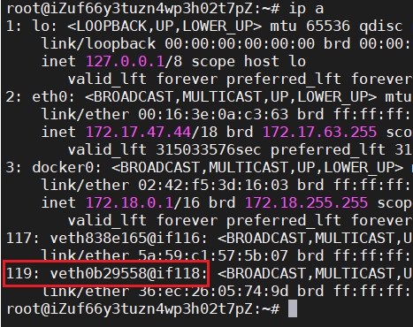 宿主机上面又多了一个 veth , 119: veth0b29558@if118
