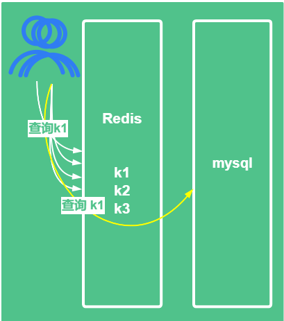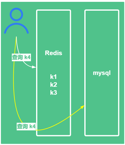 当用户巨多的时候,查询缓存都没有查询到,那么这些全部都去查询持久化的 mysql 数据库,压力全部打到 mysql 上面,这就是缓存穿透
