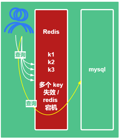 在某些热点活动中,会设置某些商品在一个固定的时间内过期,那么在 redis 里面,这个固定的时间点,大量的 key 过期,这就导致在这个时间段 缓存失效了,