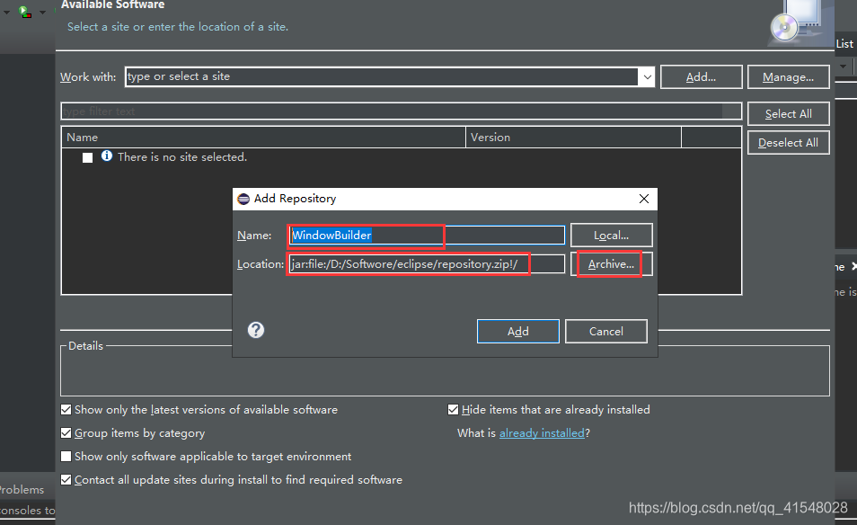 3.Name的可以名字随意起,Location中可以把WindowBuilder安装包的地址粘贴进去,也可以点击Archive添加,然后点击Add按钮。