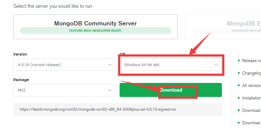 首先进入https://www.mongodb.com/download-center/community下载MongoDB,选择适用的版本
