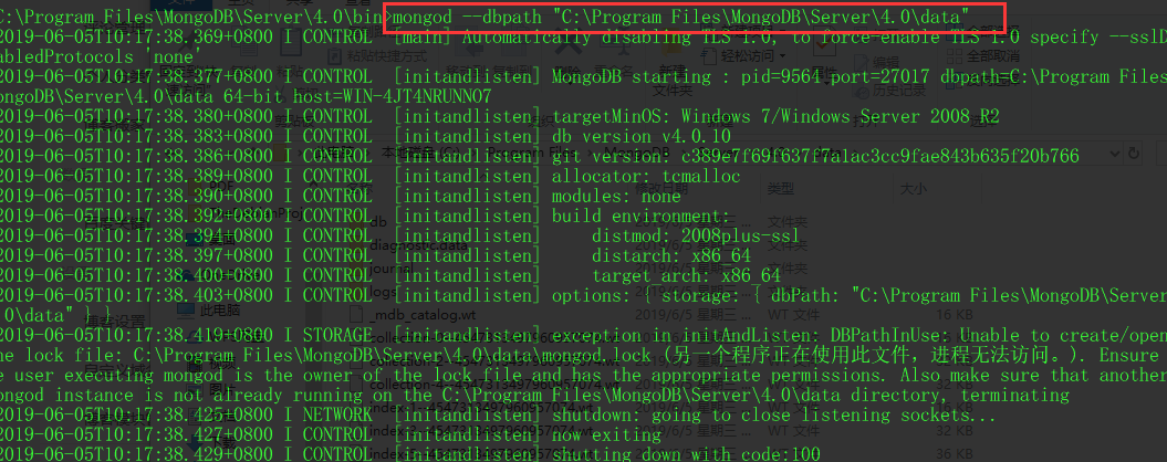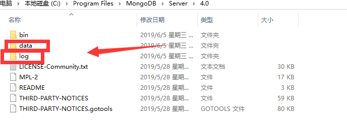 在新版本的MongoDB中,无需创建data和log文件夹,因为在安装时会自动生成该文件夹,但是要在目录下创建data文件夹,在data文件夹下的db文件夹下创建mongo.log文件(先创建一个mongo.txt文件然后更改后缀名为log)