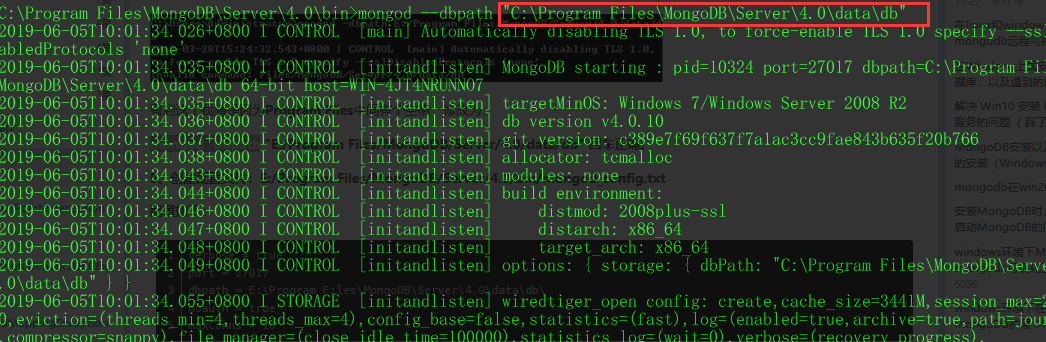 配置数据路径和日志路径C:\Program Files\MongoDB\Server\4.0\data\db,不要直接输入路径,路径用“ “” ”括起来。