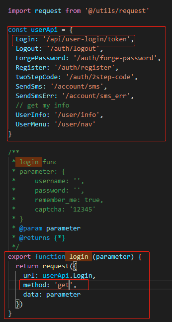 这个页面就在我们的src\views\user里面,这就是我们最先能看到的页面了,我们可以先看看看这个页面里面都有那些东西,刚开始的这个页面可以不用过多的去改动,我们直接去用就可以了。但是有几个点我们是要主义的,由于我们的这个项目所有的请求都是其内部的,所以我们要更改他的所有的请求,并根据我们自己接口的需要进行进一步的更改。要更改我们的请求我们就可以先去看看文档。