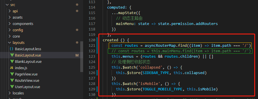 然后我们要在src/layouts/BasicLayout.vue里面再次引入