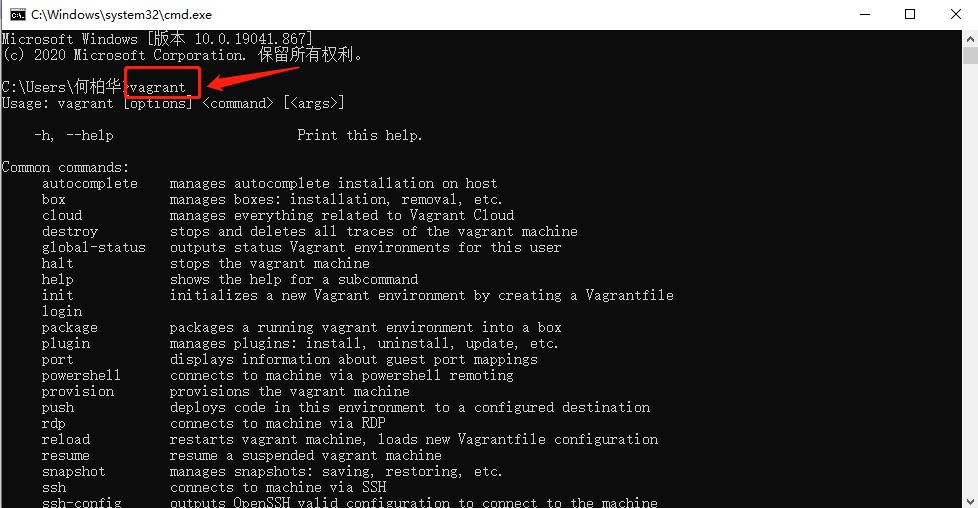 3)安装到自己喜欢的位置后,打开cmd窗口,输入vagrant命令,能看到下面的信息,说明安装成功