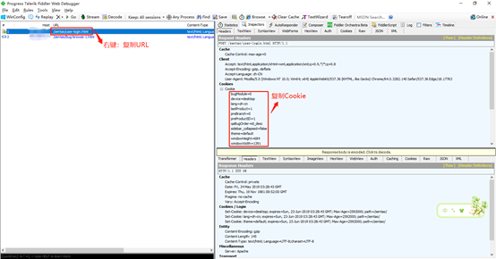 3.首先使用浏览器输入用户名,密码,验证码后,通过Fiddler抓包,获取login接口,Cookie。右键:仅复制URL,粘贴到postman的接口输入区图4的Pre-Pre-request Script下loginRequest 函数的url中。Cookie填入图1中的3区域Headers下的Values中,如图3所示。