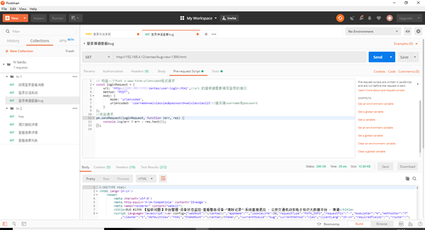 4.在Pre-request Script中添加预登录信息,以便在调用接口前先登录账号。这样一来,调用接口会返回正确的值了。
