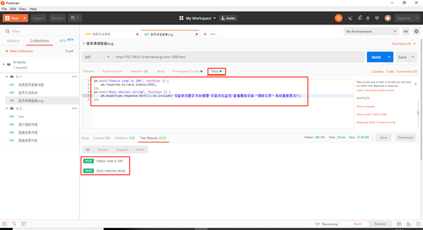 5.Tests中加入需要对该接口响应的判断,接口的返回信息是否与期望一致。此步骤可加可不加。