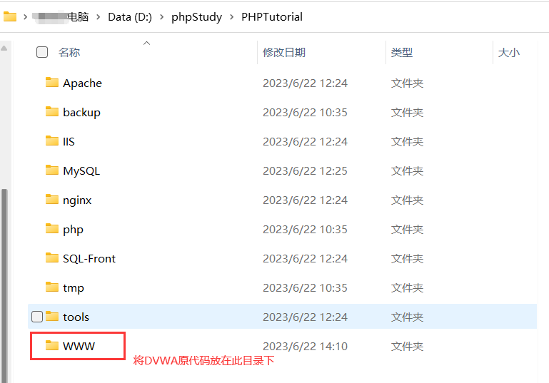 - 将解压后的DVWA原代码防止在phpstudy/PHPTutorial安装目录的WWW文件夹