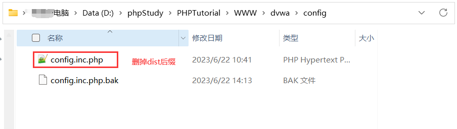 - 进入DVWA/config目录,将config.inc.php.dist的后缀dist删去。