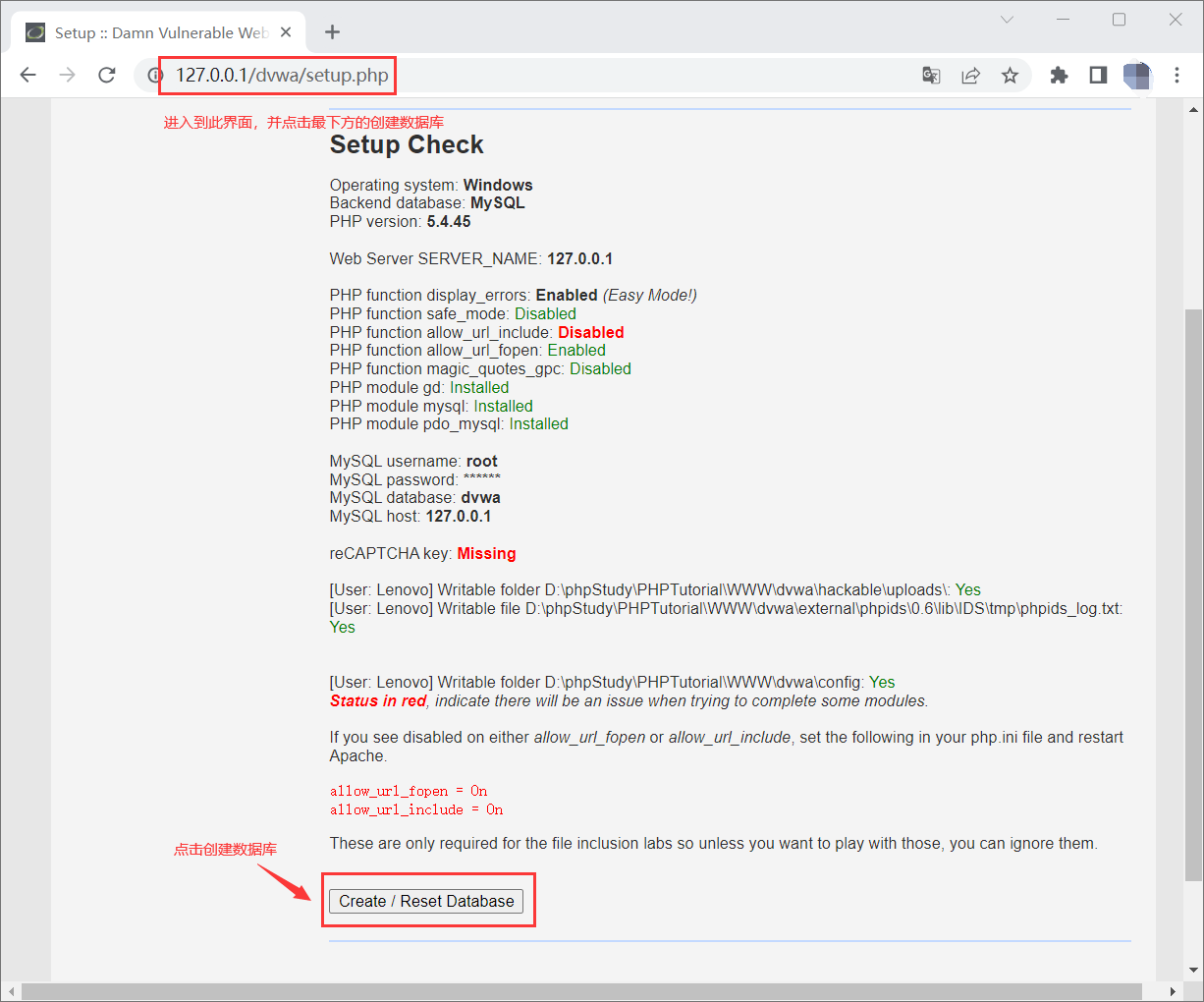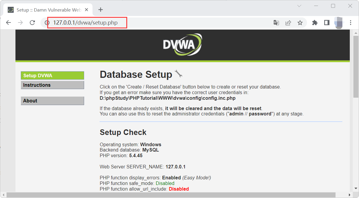 问题四:浏览器访问http://127.0.0.1/dvwa/setup.php出现404 not found的错误