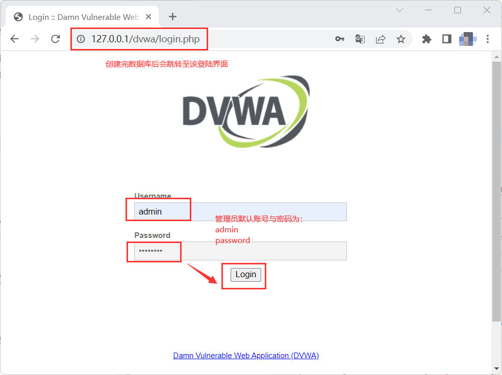- 浏览器访问http://127.0.0.1/dvwa/login.php,输入用户名admin,密码password,登陆DVWA。