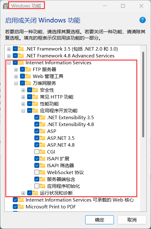 解答:控制面板——>程序——>程序和功能——>启用或关闭Windows功能,勾选以下对应的配置后确定即可,再去浏览器访问127.0.0.1或localhost。如配置完成需要立即重启时,重启生效。